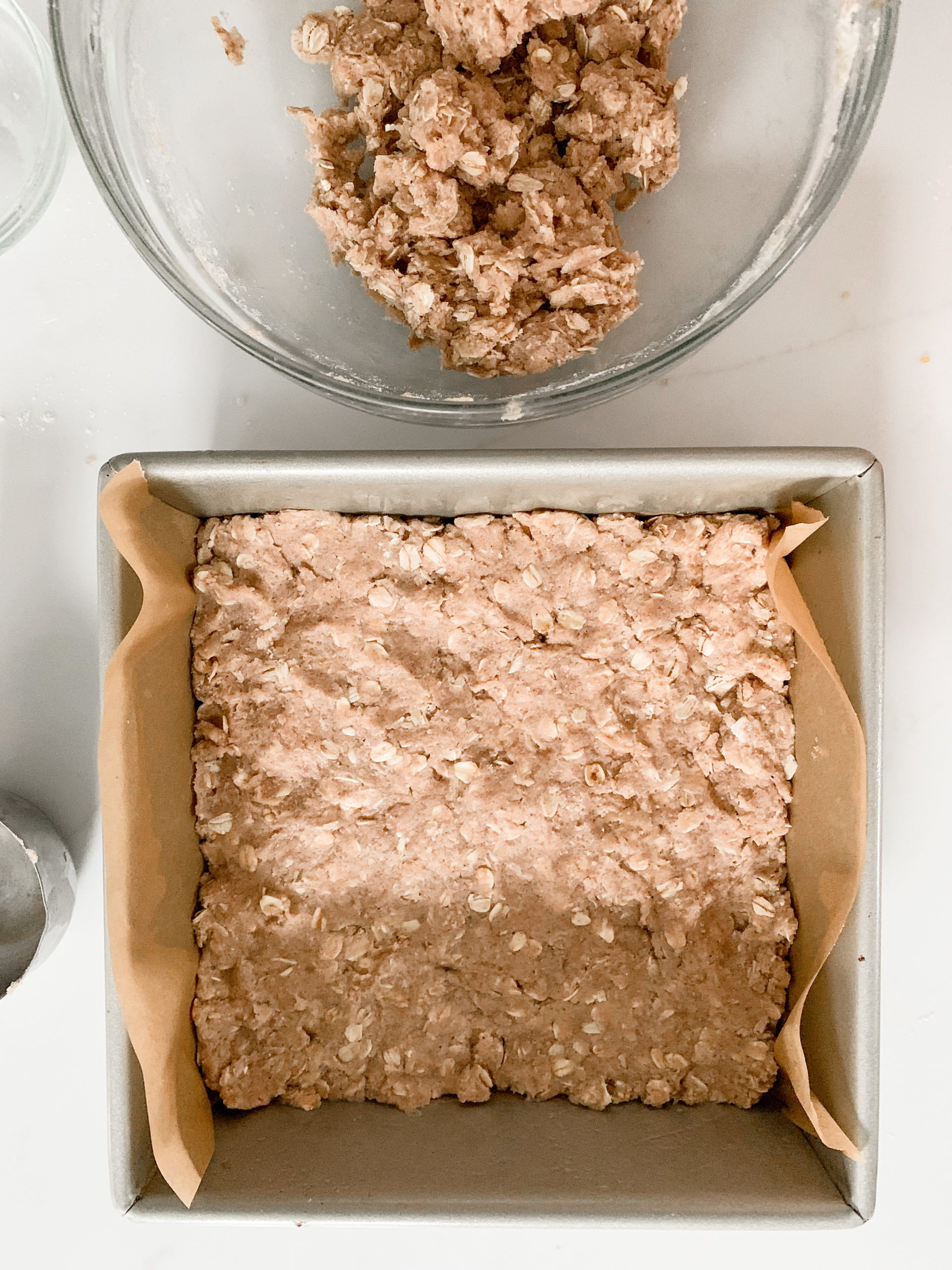 - Press 2 cups of the oat mixture (3/4 of the mixture) into the prepared pan