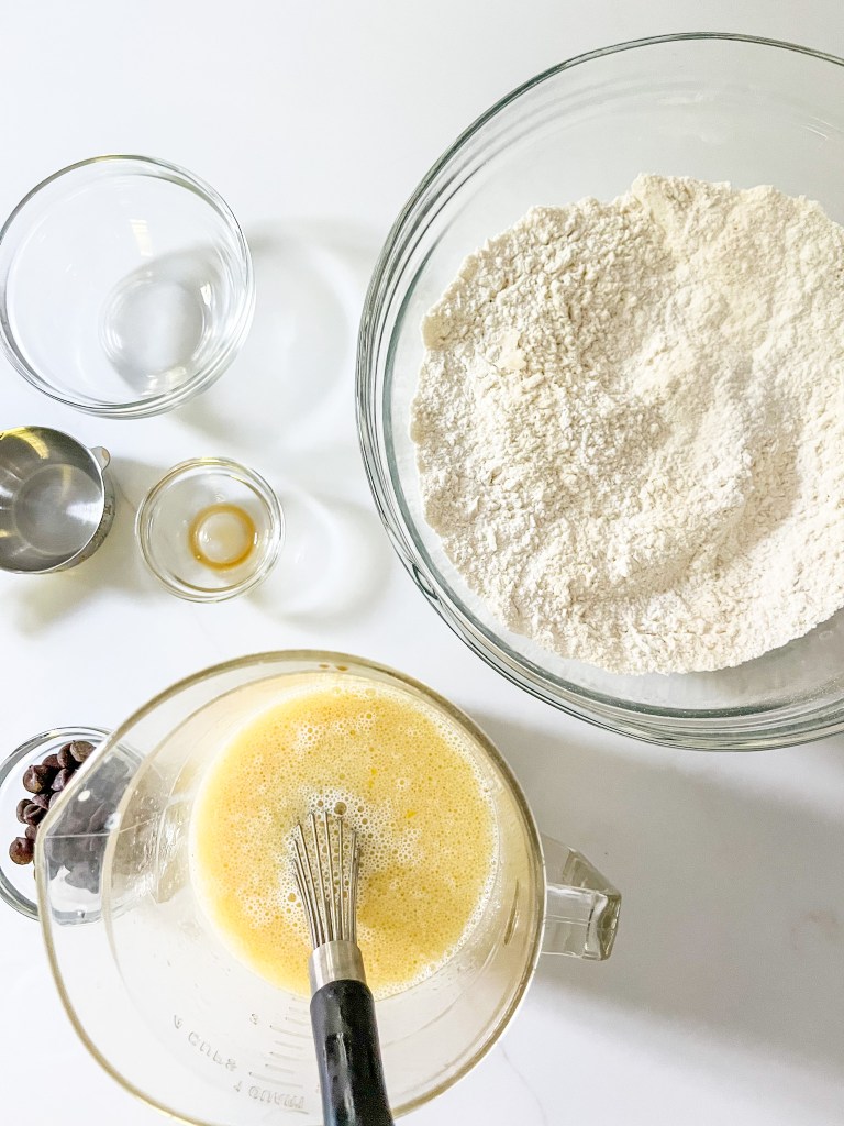- In a liquid measuring cup or small bowl whisk together eggs, milk, oil and vanilla.