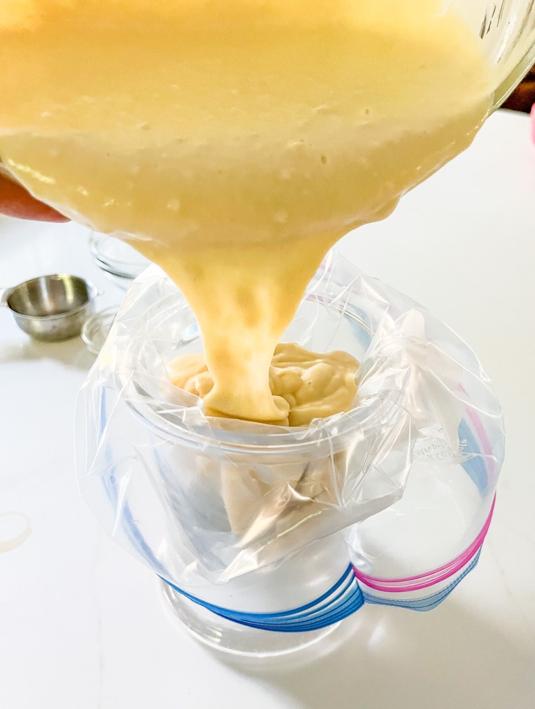 - If using a ziplock or pastry bag make sure to cut a VERY small hole at the tip(1/8 inch). The smaller the opening the more precise you will be but the batter will come out slower.