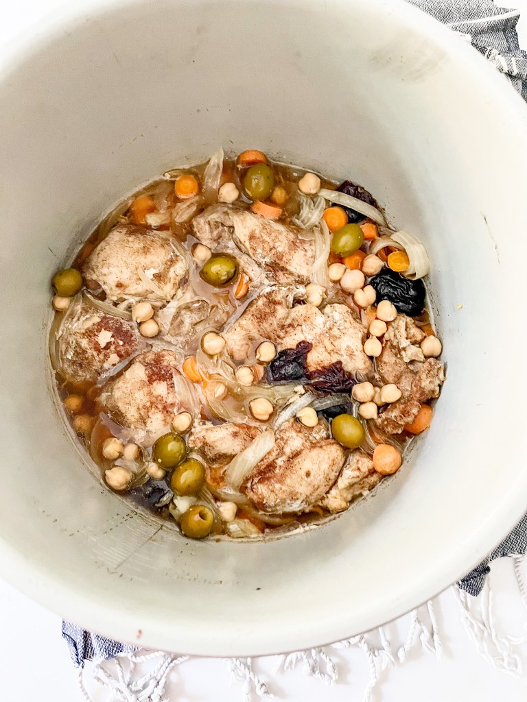 Add the chickpeas and olives for the last hour. You can add them earlier or later depending on your time constraints, but my family doesn’t like the olives cooked too much.