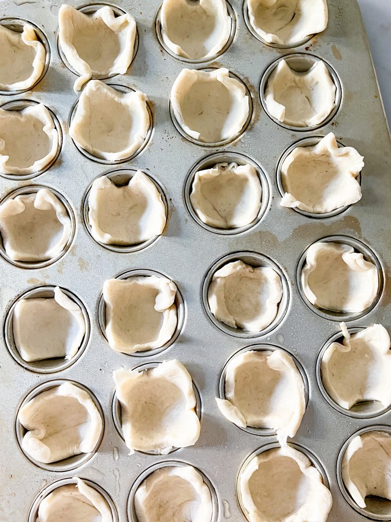 - Unroll the can of the crescent rolls into a rectangle. Pinch the seams together and roll lightly to stretch it out and bring seams together. Using a knife cut the rectangle into 24 squares (mine were not all perfectly the same size). Press each of the squares into a lightly greased mini muffin tin.