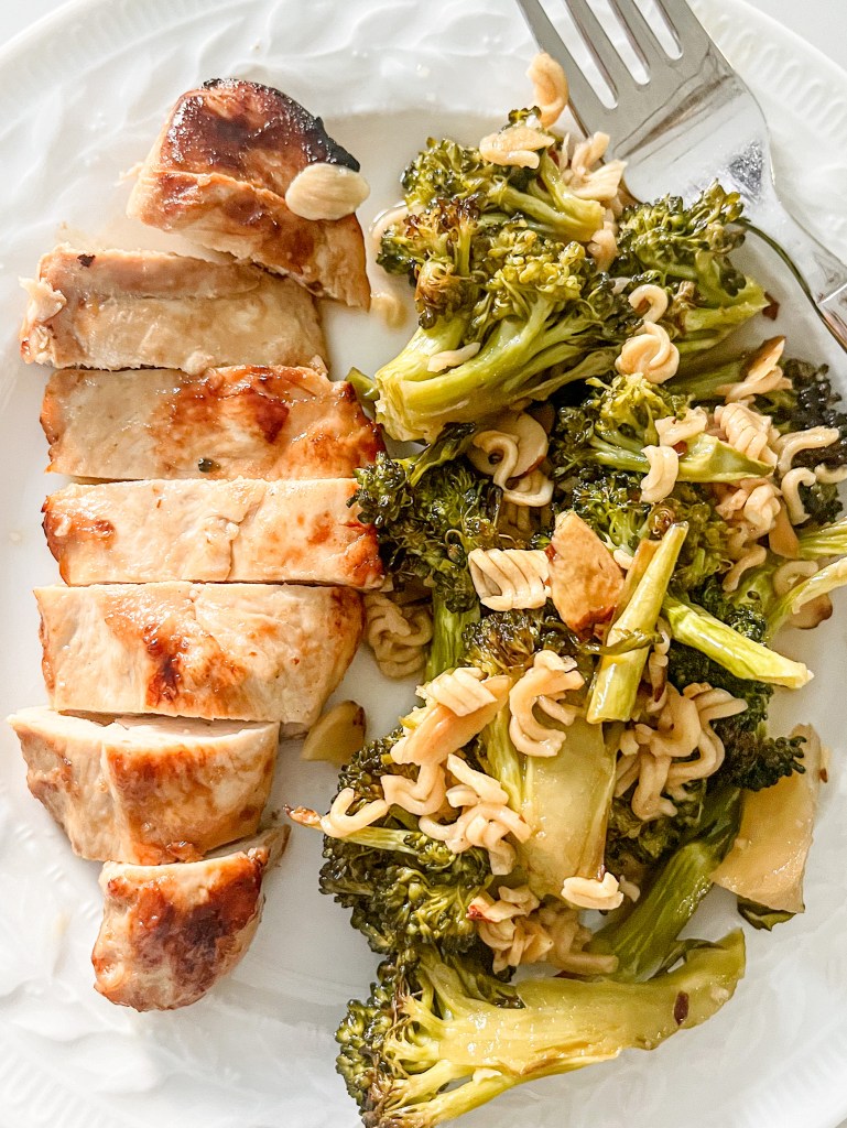 This Roasted Broccoli with Crunchy Ramen Noodles comes together with simple ingredients and is a fun twist on the traditional ramen slaw recipe. The whole thing comes together in about 30 minutes. Just spread your broccoli on one sheet pan and toss with olive oil and salt. On another pan spread out your crushed ramen noodles and sliced almonds and toss with melted butter and salt. While they are baking make the dressing. Add the dressing to the broccoli as soon as it is done roasting, but wait to put the crunchy topping on until you are ready to serve.